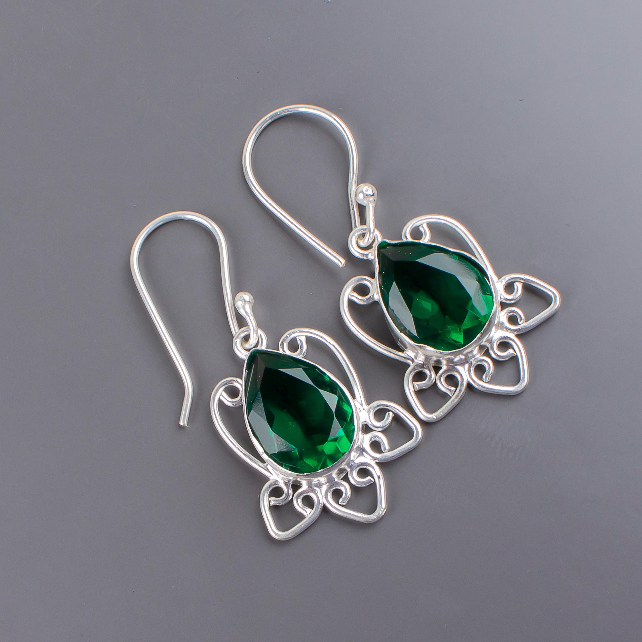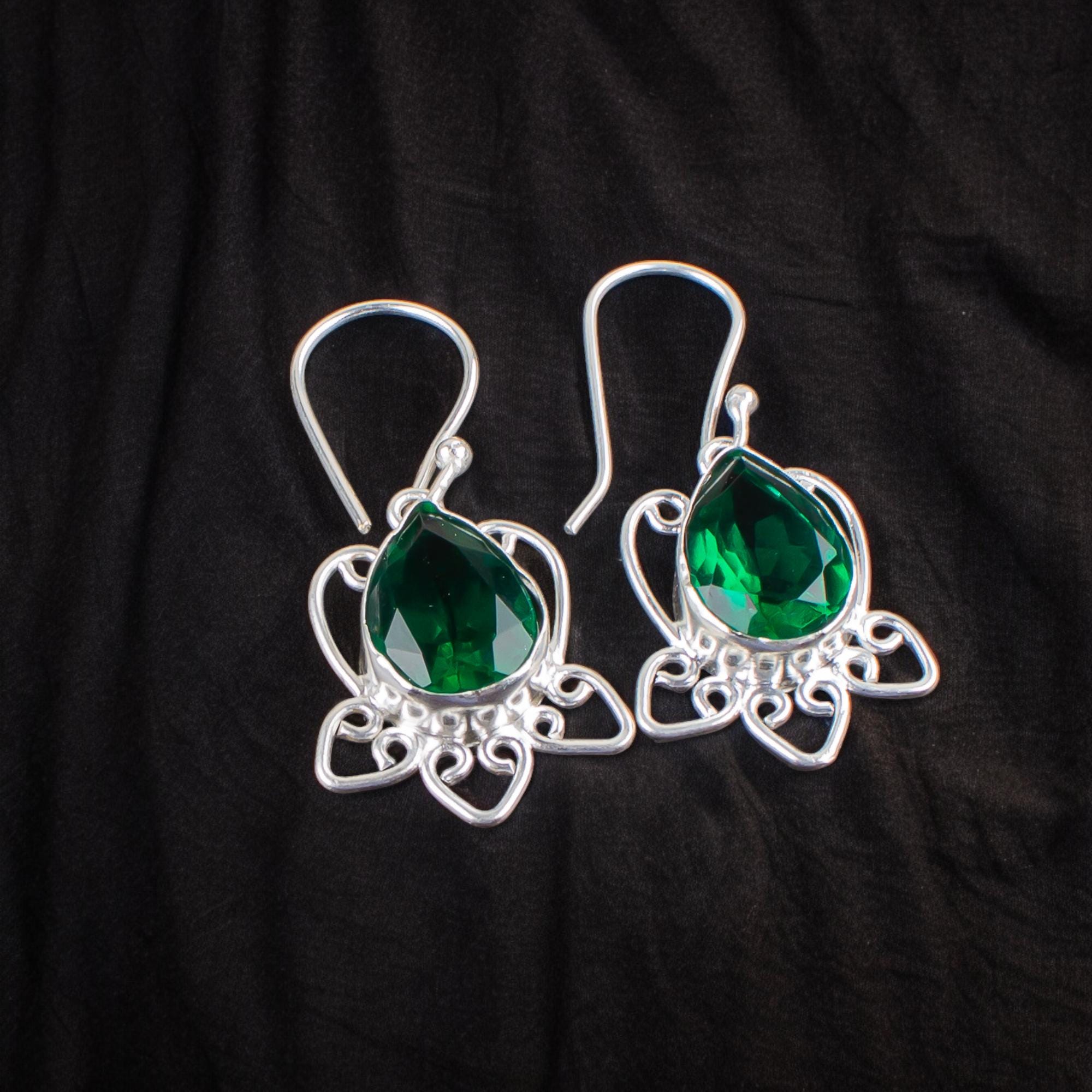 Emerald Dangle Earrings: Handmade 925 Sterling Silver Gemstone